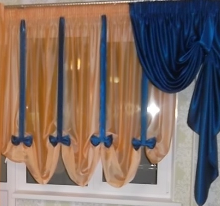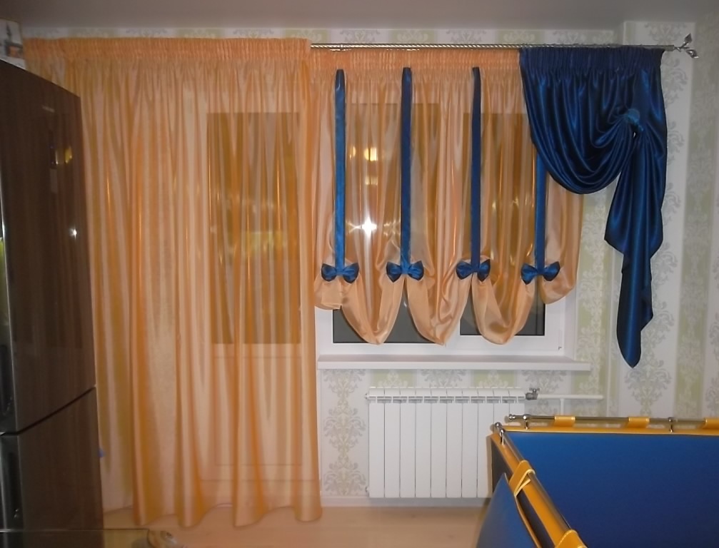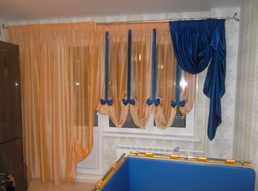Все цвета подобраны под интерьер помещения. Справа декоративный тюль до подоконника хаотично подхвачен лентами с бантиками. Слева тюль в пол, закрывает балконную дверь. Для уравновешивания углов оконного проема, на вторую линию задрапировали декоративную штору. Вся модель, таким образом, смотрится гармонично и красиво.