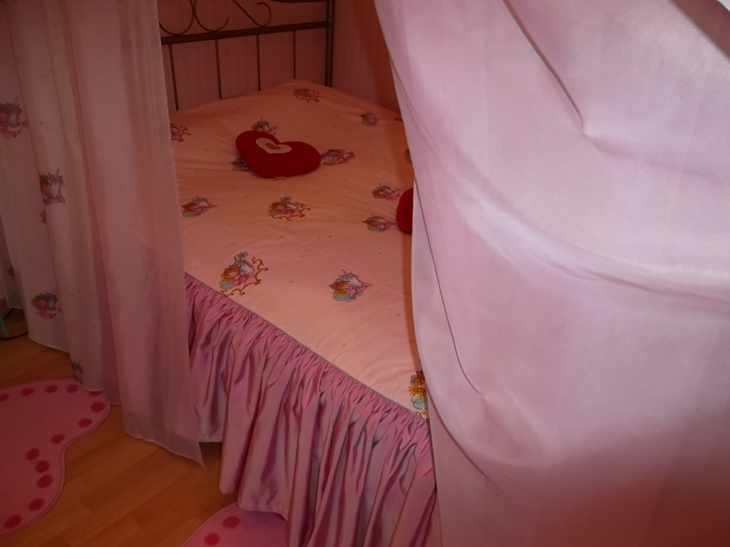 Решение: Балдахин сшит из разных частей тканей, соединяющихся липучкой. Наверху каркаса детской кровати натянута розовая вуаль, делая всю конструкцию закрытой.