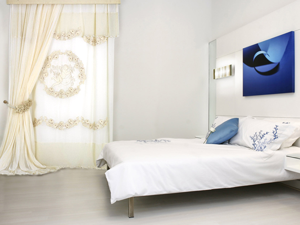 Решение: Шторы однотонные из светлой ткани лежат на полу, подхвачены на одну сторону Тюль берет акцент на себя. Ламбрекен простой на жесткой основе-бандо.