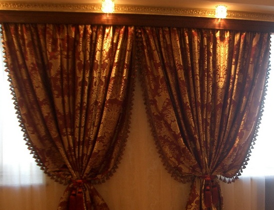 Решение: Портьеры с декоративной бахромой по бокам Шторы подхвачены по центру декоративными классическими кистями в тон ткани. Благодаря этому большое помещение смотрится очень интересно.