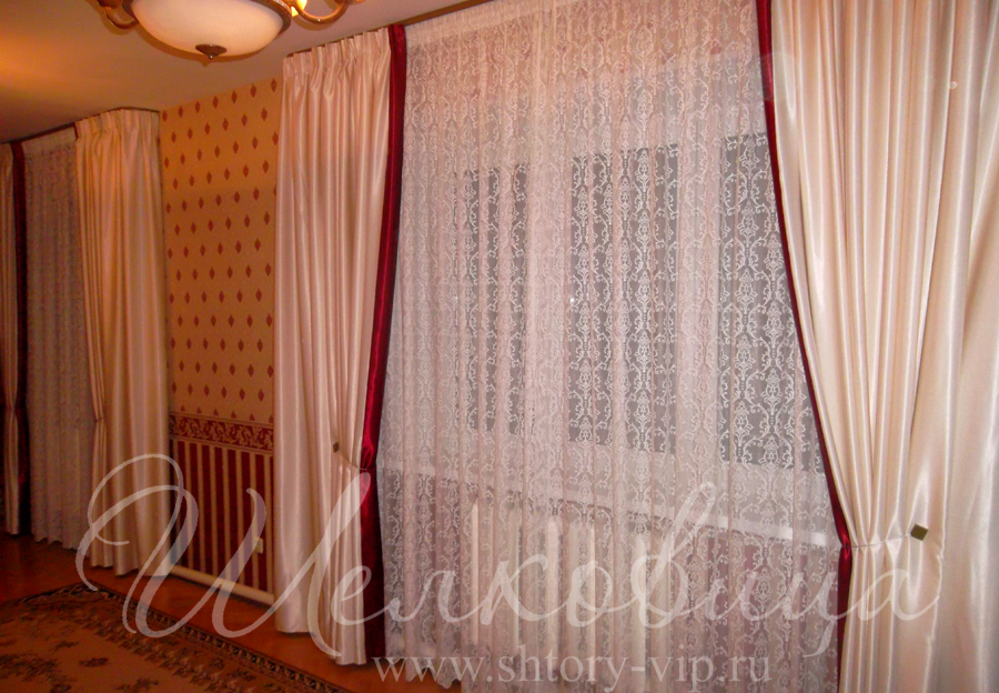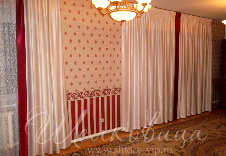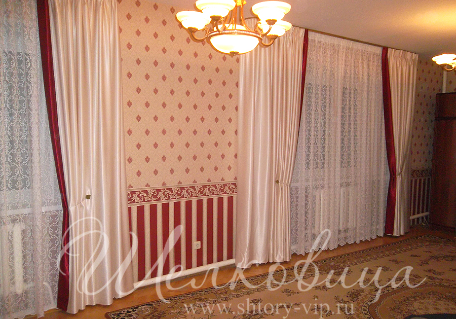 Решение: Классика Тщательный подбор тканей в дизайне штор удерживает гармонию в интерьере большой гостинной.