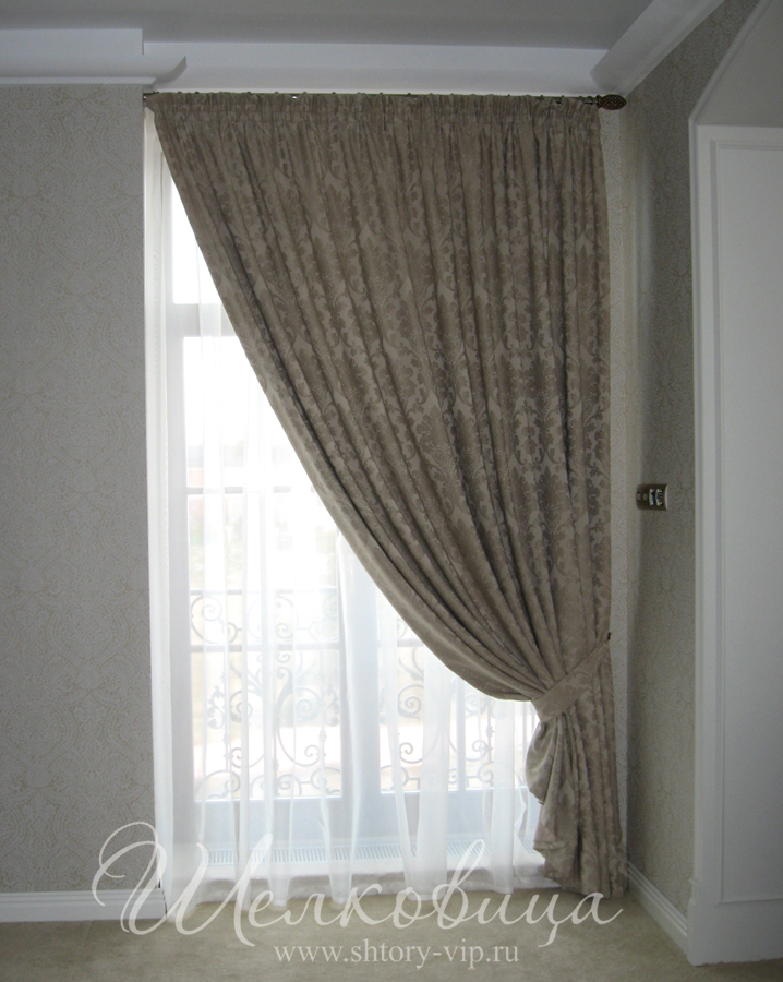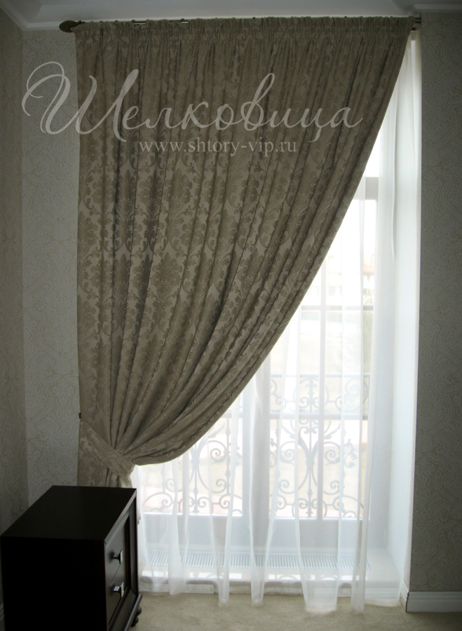 Классический вариант для спальной комнаты: белоснежная тюль и плотные шторы обеспечивают гармонию и стиль. Рисунок на портьерах тонко сочетается с рисунком на стенах.