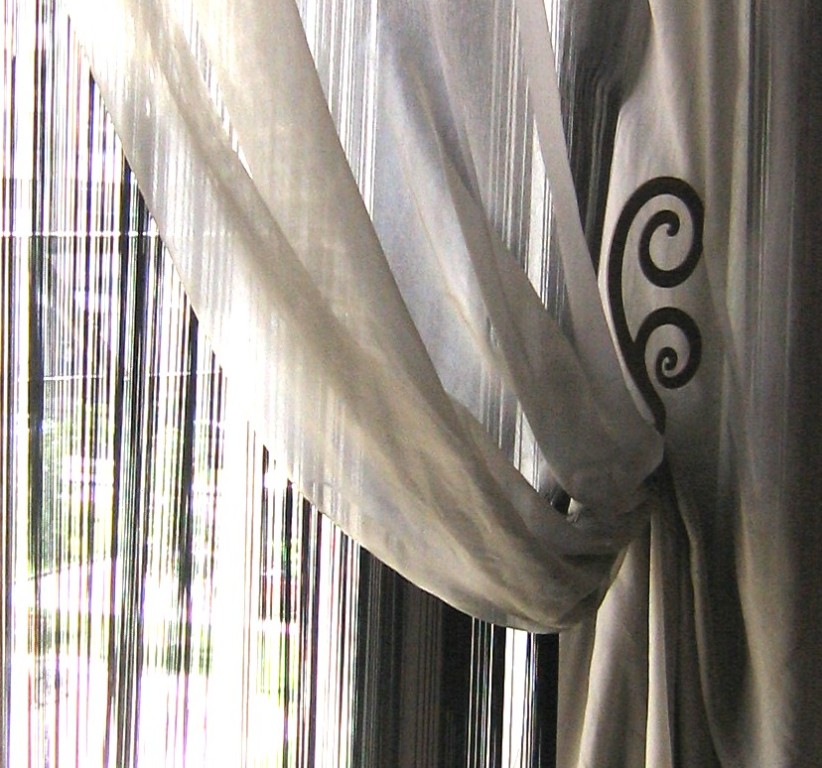 Решение: Веревочные шторы заменяют тюль Декоративная штора из полуорганзы, задрапированная кованым подхватом, дополняет и придает красоту оконному проему.