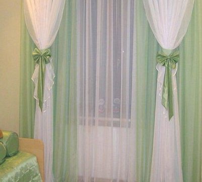 Решение: Декоративные шторы собраны во встречную складку, сверху пришита лип лента Бантики на подхватах сделаны для красоты. Шторы лежат на полу. Покрывало с валиками сочетаются со шторами.