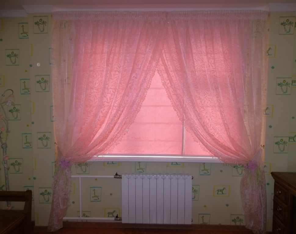 Римские шторы сделаны на подкладке темно-розового цвета, что придает выразительность в данный дизайн модели. Стеклярус, пришитый по бокам тюля, делает комнату нежной.