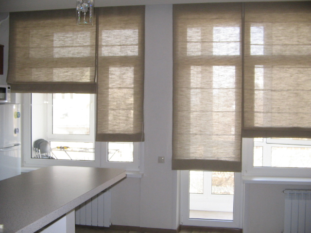 Решение: Небольшие римские шторы дробят окно на части, делаясь удобными и практичными в использовании. А льняная ткань придает свежесть и натуральность помещению.