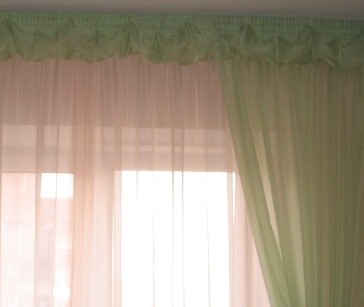 Решение: Шторы с воздушным ламбрекеном Ламбрекен и декоративная штора сшиты вместе на одной шторной ленте, с изнанки пришита лип лента. Рекомендуемая модель для небольшого помещения.