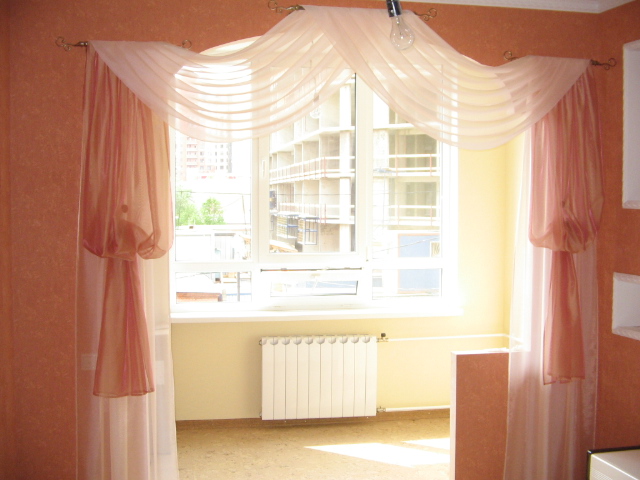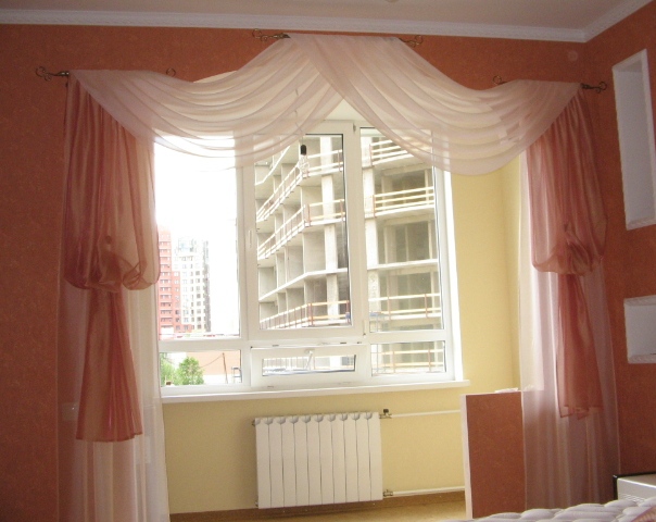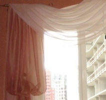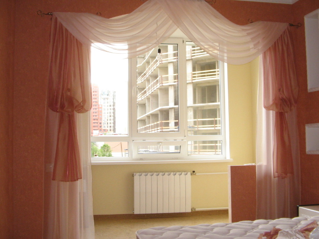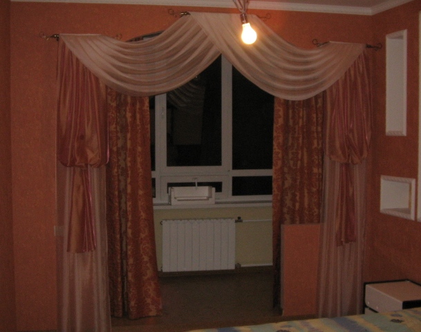 Цель - подчеркнуть ламбрекеном и шторами проем в спальне. Цвет портьер и декоративных штор на магнитах сочетаются с цветом стен помещения. А цвет свагов и прямых декоративных штор освежает и придает осветление спальне.