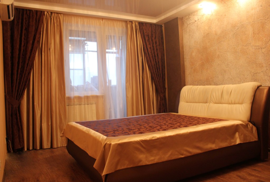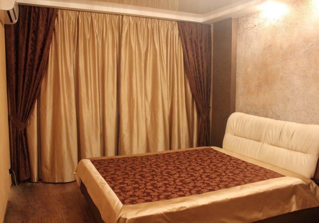 Решение: Шторы рабочие и декоративные, покрывало Декоративные шторы сочетаются со вставками на стенах, а узор на шторах делает акцент, тем самым придает «изюминку» данному помещению.