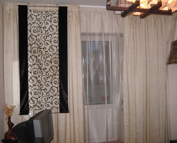 Шторы и тюль нейтральны. Мелкий вензель на декоративном панно и покрывале повторяет рисунок, сделанных на колпаках люстры, а двухсторонняя обтачка, сделанная из черного бархата, придает выразительность и утонченность модели.