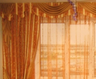 Фигурный ламбрекен на жесткой основе – бандо легко сочетается с двухсторонними шторами и тюлью с вышивкой. Из чего следует, элегантность и изящество гостиной.