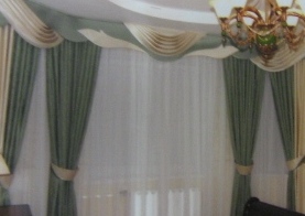 Шторы, покрывало и подушки сделаны из одних и тех же тканей. На модели сделана имитация как будто драпирующие части ламбрекена по бокам переходят во вторую часть портьер. Такая модель делает шикарной и богатой спальню.