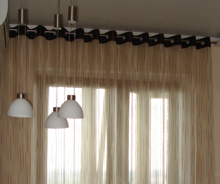 Решение: Кухня выполнена в современном стиле. Люверсы выбраны под цвет карниза Цвет тюля гармонирует со стенами, а обтачка, сделанная на контрасте, придает акцент оконному проему.