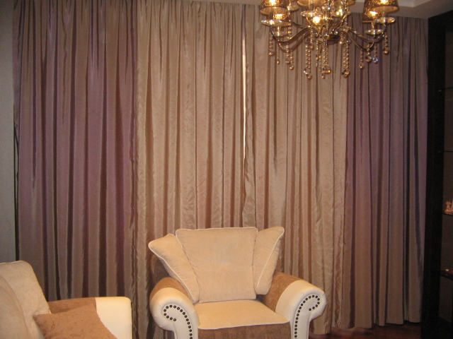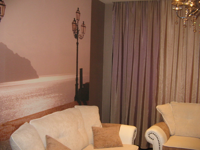 Комната сделана в теплых тонах, благодаря портьерам, состоящих из двух родственно контрастных цветов ткани в сочетании с картиной на стене, гостиная становится уютной и нежной.