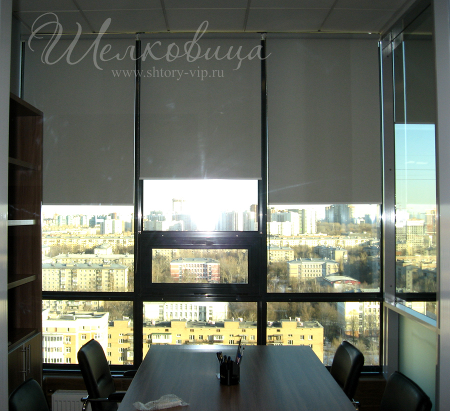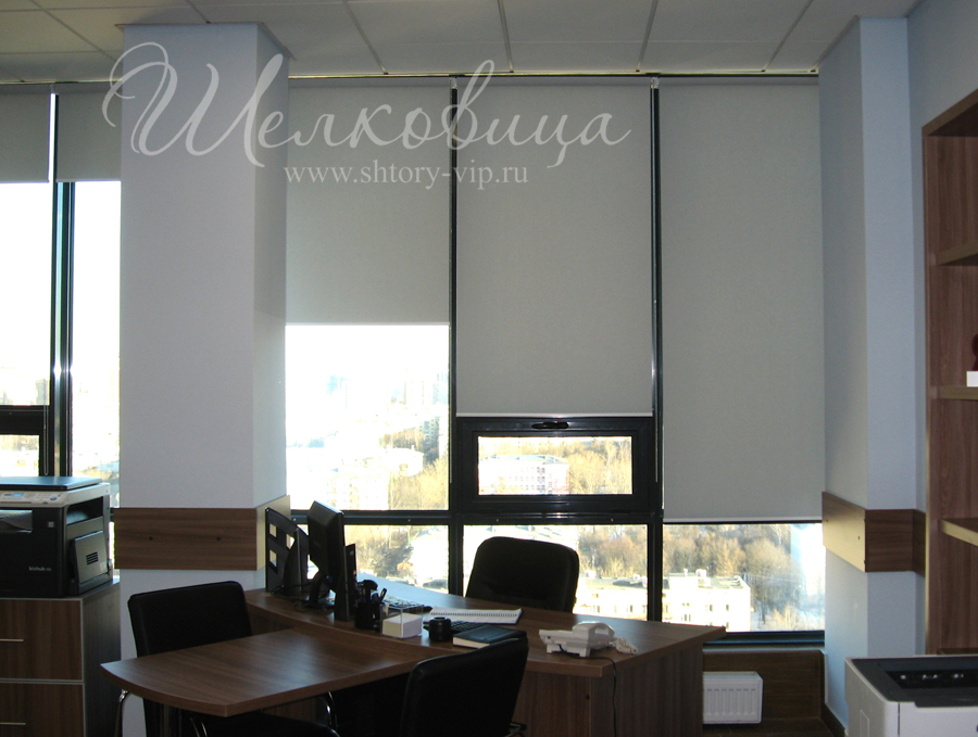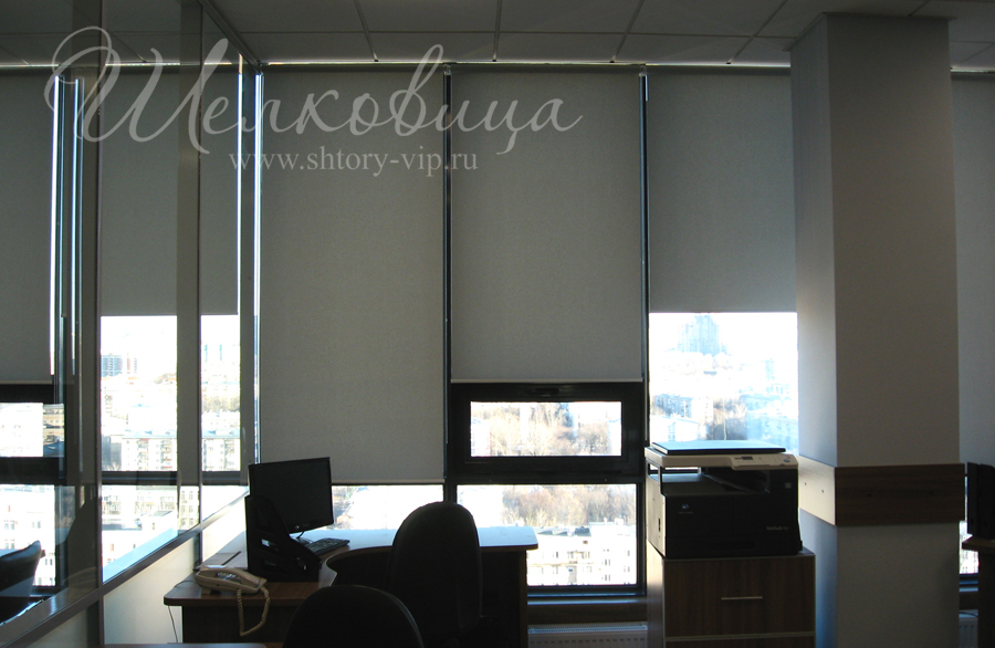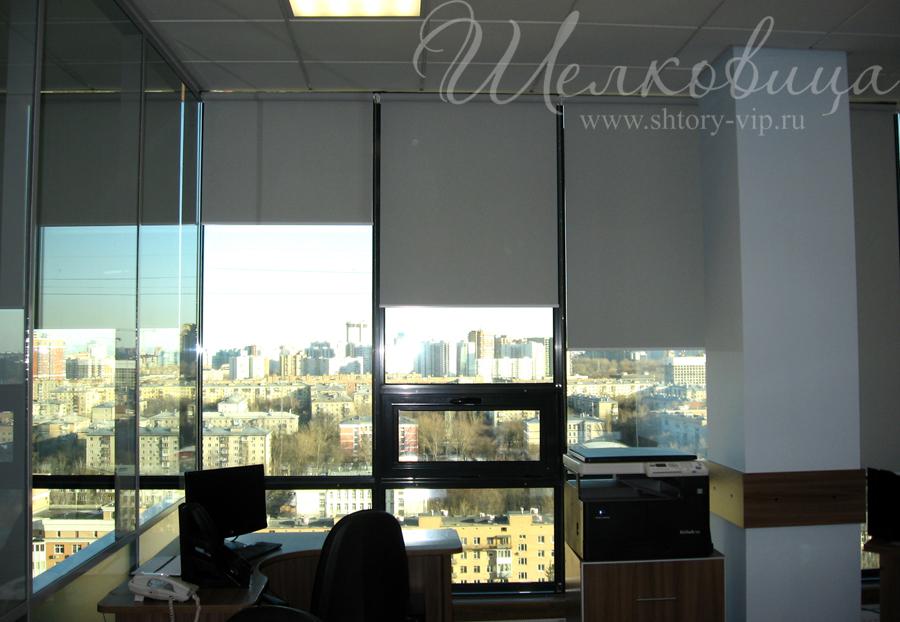 Рулонные шторы в офисе на солнечной стороне здания просты по решению и удобны в управлении. Подбор цвета и плотности рулонной ткани исполняется в большом спектре, по образцам.