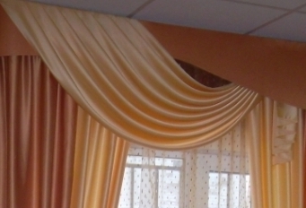 Решение: Штора на подхватах из двух тканей Ассиметричный ламбрекен как бы объединяет два оконных проема, а контрастные цвета тканей, сочетающиеся с обоями, делают кабинет стильным и интересным.