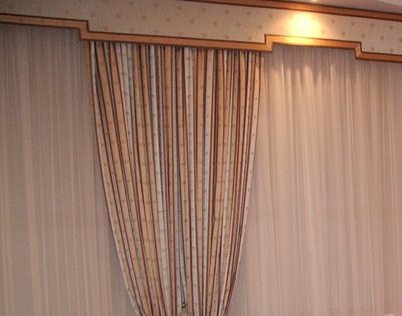 Ламбрекен на жесткой основе-бандо делает помещение строгим, а своей неординарной формы и яркой окантовкой по краям, сочетающейся со цветом штор, придает конференц-залу официальность.