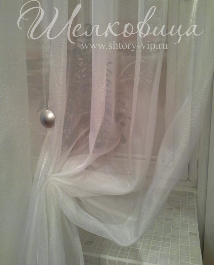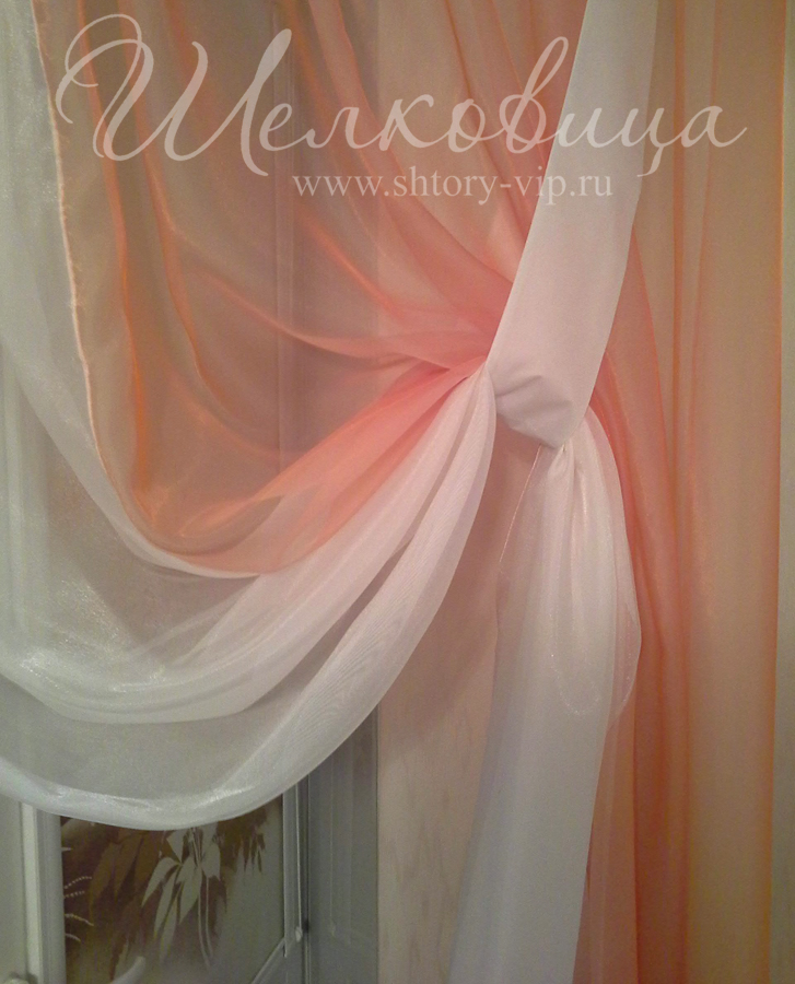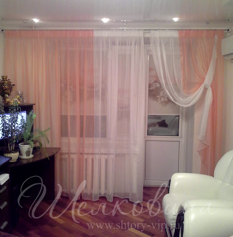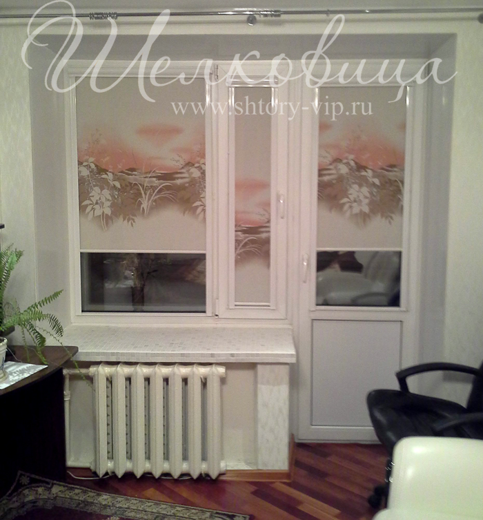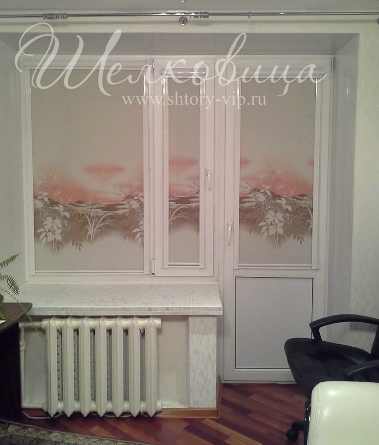 Стационарный тканевый подхват тюля в районе балконной двери обеспечивает беспрепятственный проход. Рулонные шторы с рисунком шикарно дополняют дизайн окна.
