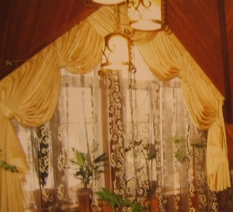 Шторы декоративные, задрапированные подхватами, и сваг сделаны на одном карнизе. Так помещение выглядит интересным и индивидуальным.