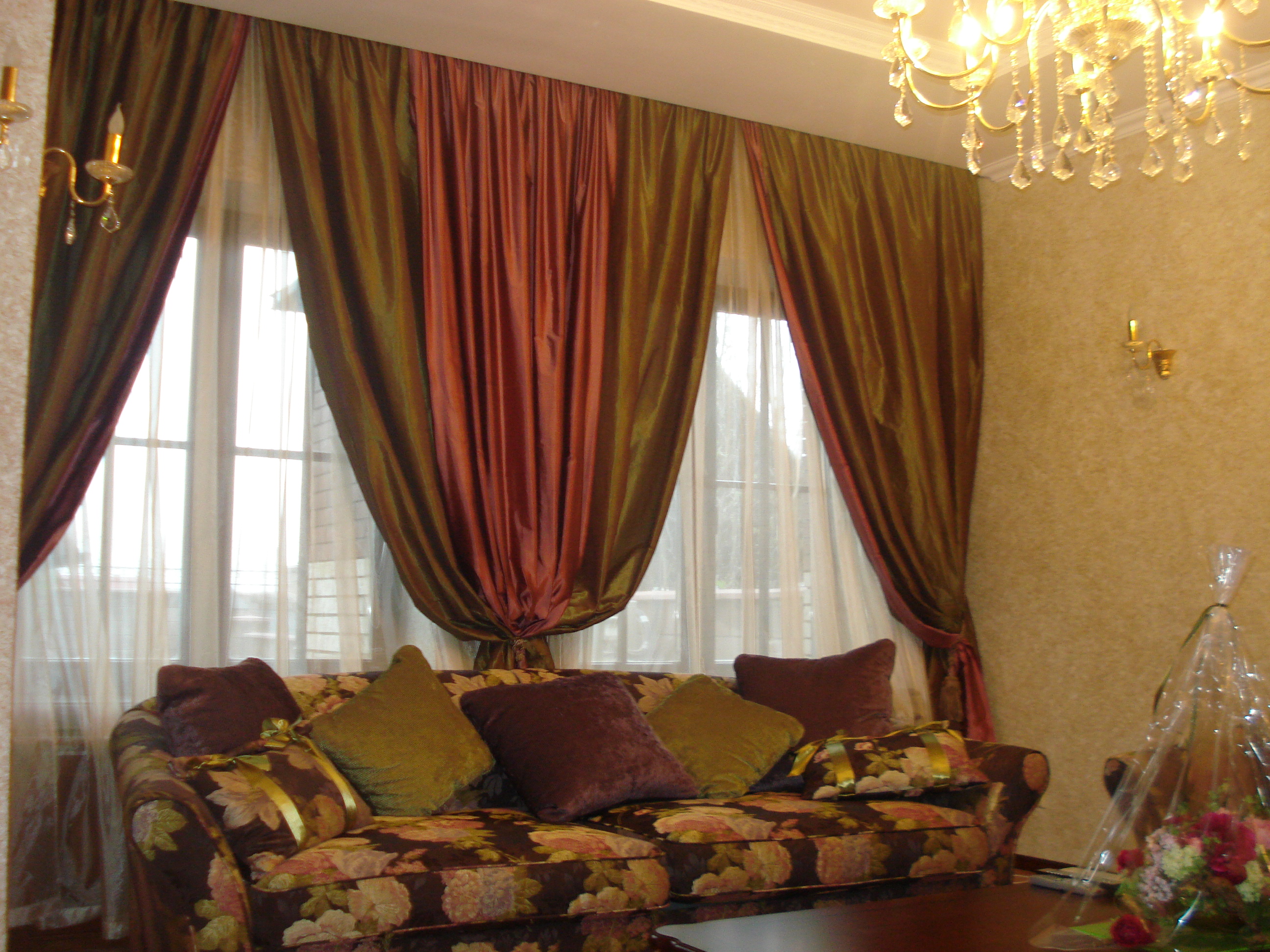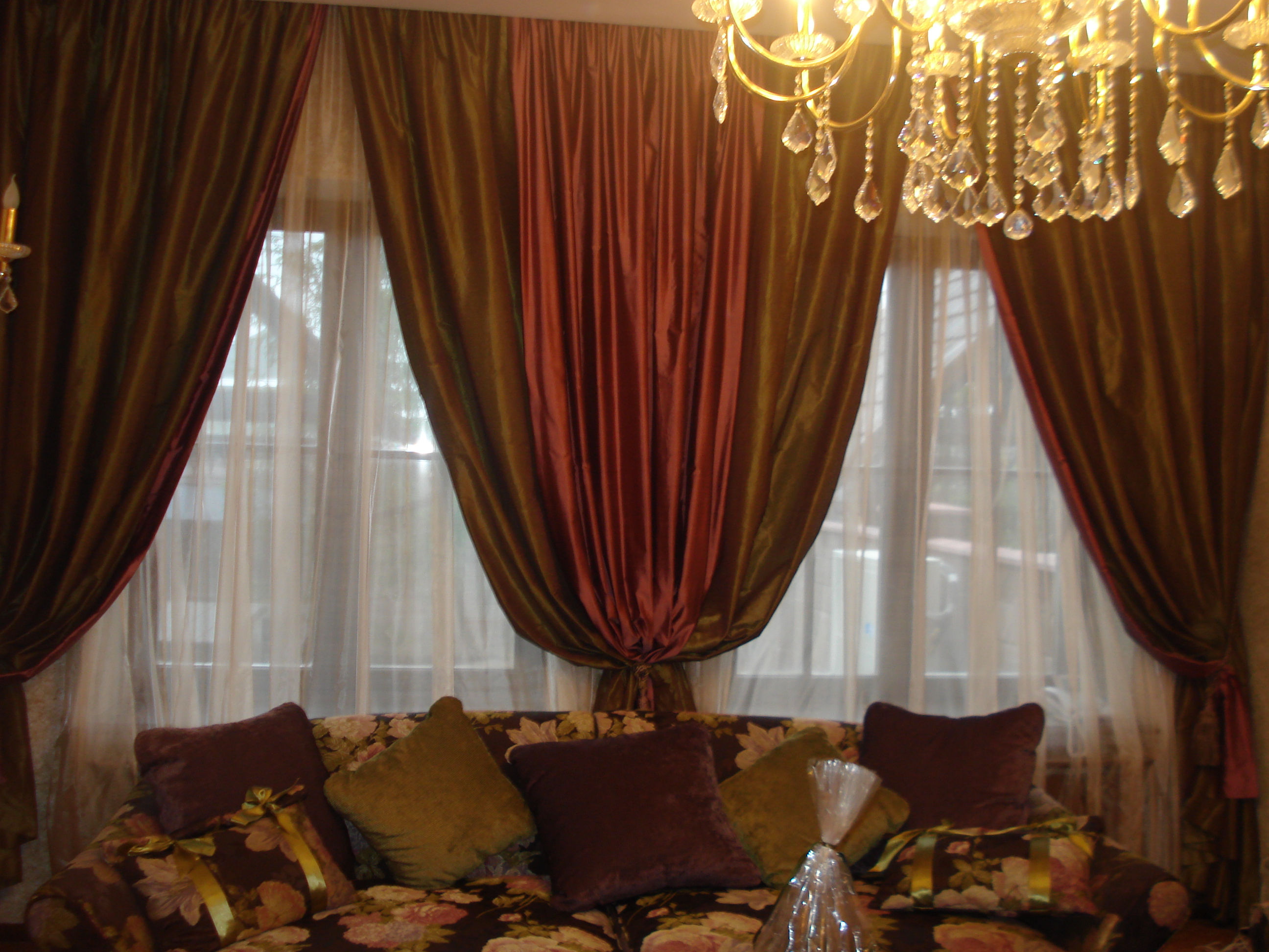 Шторы из плотной ткани в малиново-зеленом оттенке. Тюль из белой шелковой вуали