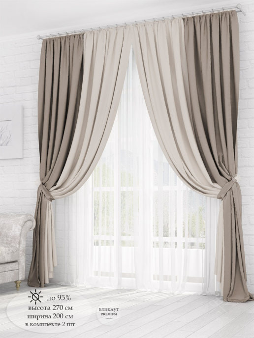 Комплект Муза из коллекции - Здоровый сон. В упаковке 4 предмета: шторы 2 шт - 270 см (выс) * 200 см (шир), подхват - 2 шт. Крепление к карнизу - шторная лента для крючков и кулиска (6 см), куда можно продеть трубу. Комплект выполнен из мягкой трехслойной ткани блэкаут (светонепроницаемость 90%) в классических спокойных тонах. Блэкаут отлично защищает от солнечных лучей, не выгорает, не линяет и имеет долгий срок службы. Благодаря многослойной структуре блэкаут задерживает посторонние звуки и шум. Шторы из блэкаута гипоалергенные и просты в уходе.
