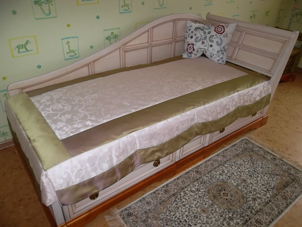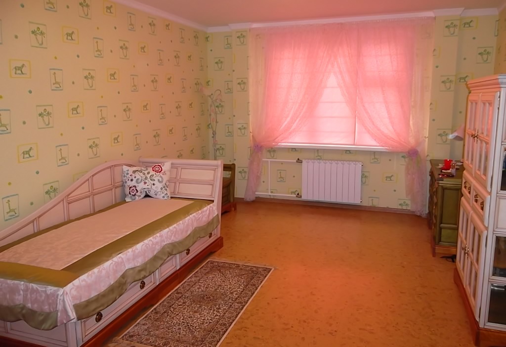 Шторы и покрывало сделаны в бледно-розовых тонах, в сочетании с углубленно- зеленым цветом.