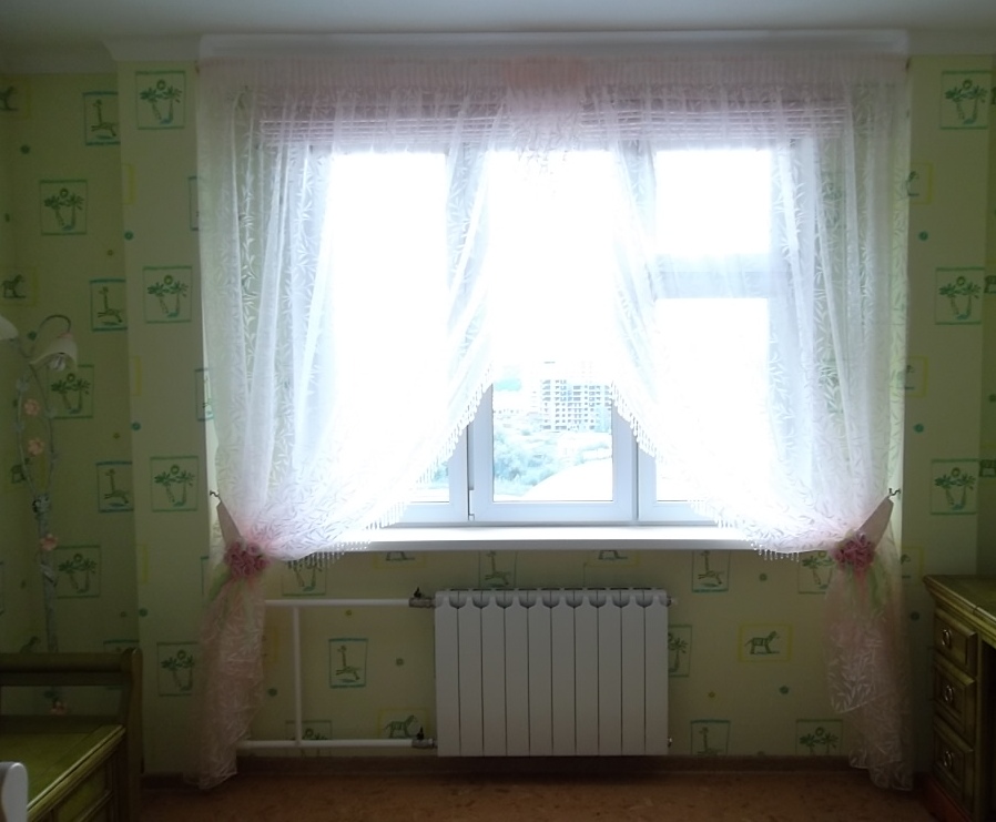 Римские шторы сделаны на подкладке темно-розового цвета, что придает выразительность в данный дизайн модели. Стеклярус, пришитый по бокам тюля, делает комнату нежной.