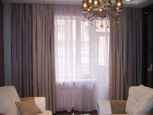 Комната сделана в теплых тонах, благодаря портьерам, состоящих из двух родственно контрастных цветов ткани в сочетании с картиной на стене, гостиная становится уютной и нежной.